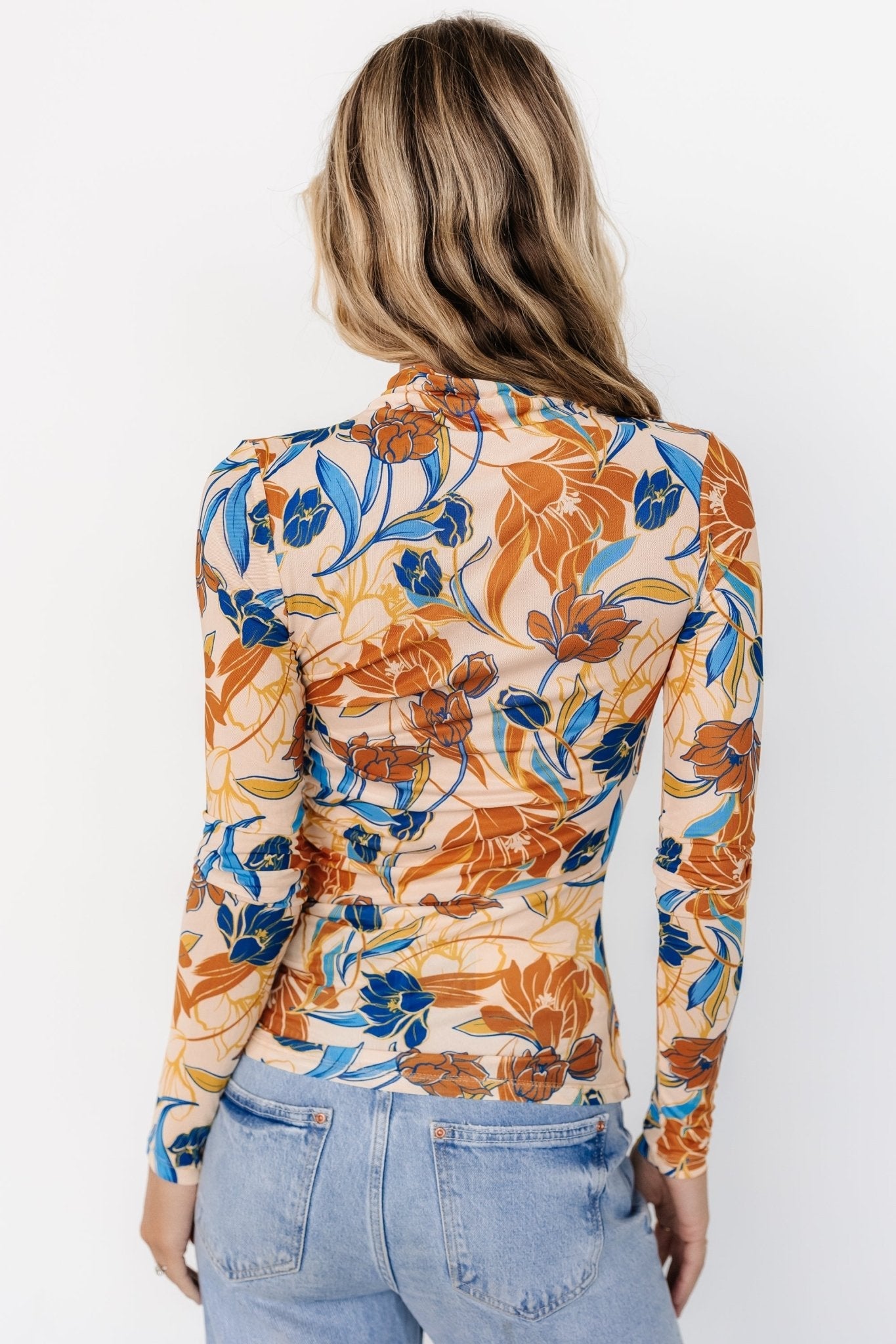 • Taupe base with blue, yellow, and orange floral print
