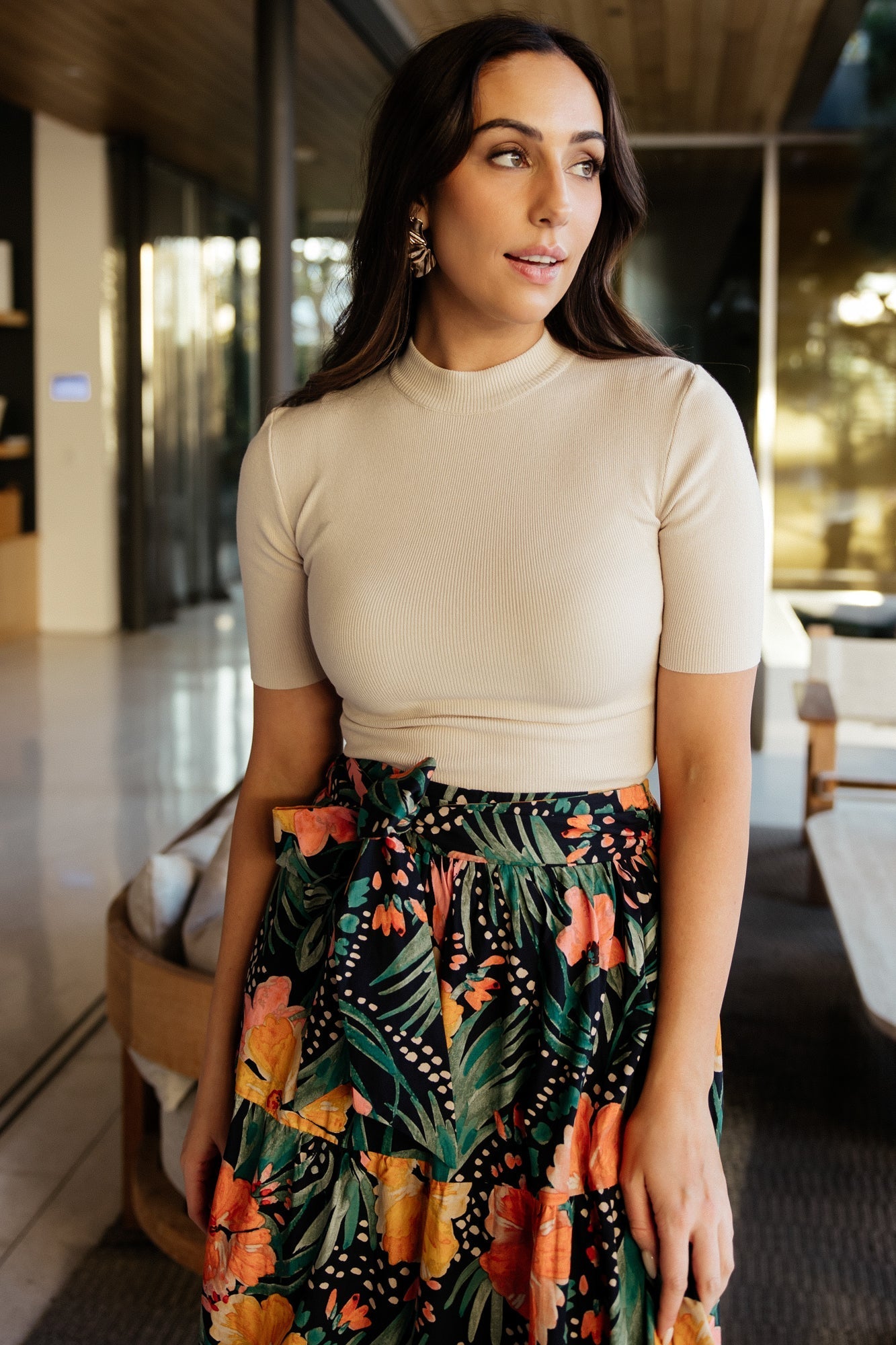 - Paired with our Parvati Smocked Waist Pants in Black and our Melea Skirt in Navy Multi Floral