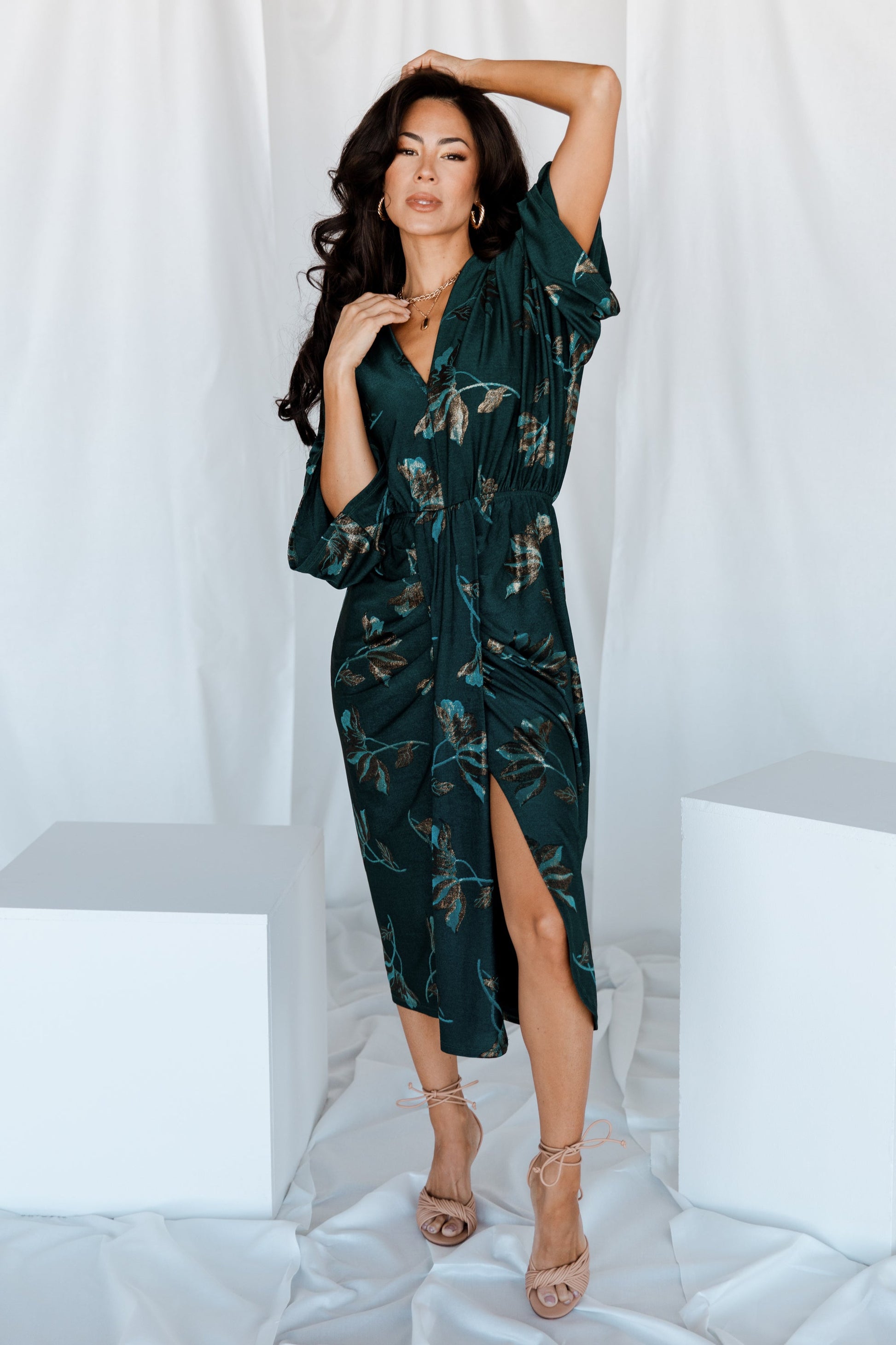 Shaneen Ruched Midi Dress | Jade Floral Shimmer